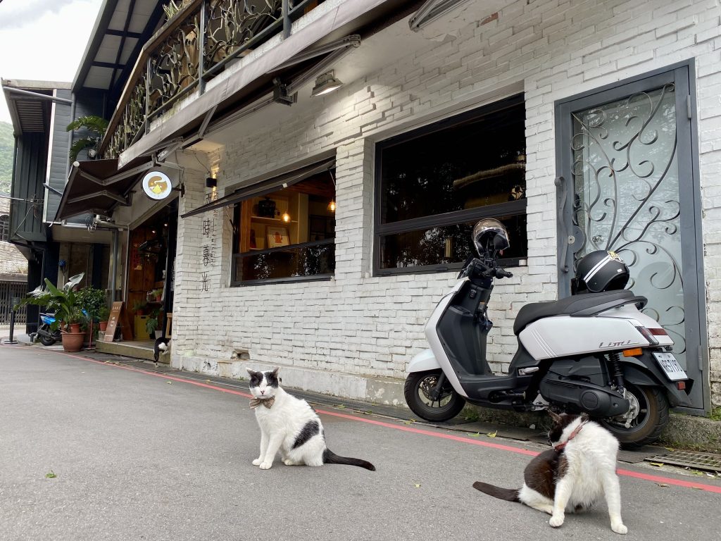 到了九份后,与他们一行人辞别,就慢悠悠的游览九份了。简单说份分,就是一个建在山上的小镇。类似于重庆的十八梯或者山城步道。九份有些地方真的很惬意宁静,适合一个人在那发呆消磨时光。就好比我在一家咖啡店前看到几只打领结的猫。